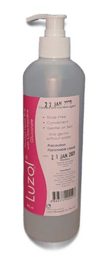 Our LUZOL is 70% from the grade of 99.9% ETHANOL plus 4% of CHLORHEXIDINE 20% solution in the bottle, suitable for rinse-free hand applications and surfaces. It contains over 70% alcohol and kills 99.9% of bacteria on hands when used.